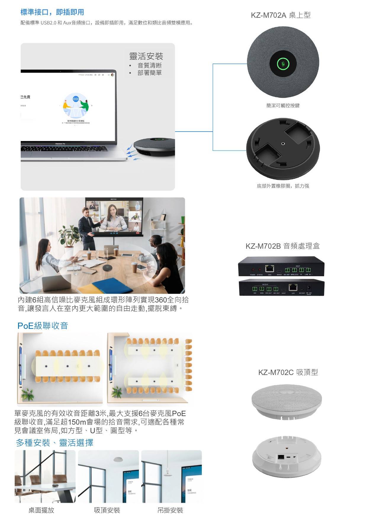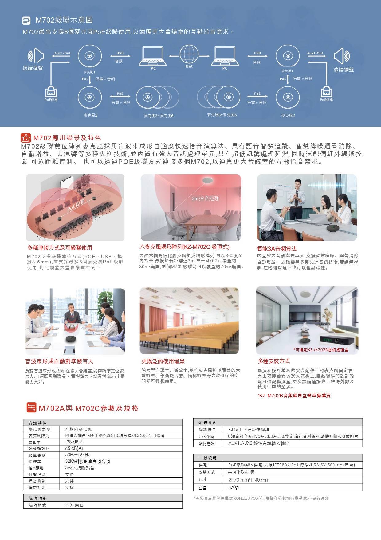 M702 級聯數位陣列麥克風採用盲波束成形自適應快速拾音演算法、具有語音智慧追蹤、智慧降噪迴聲消除、自動增益、去混響等多種先進技術, 並內置有強大音訊處理單元, 具有超低訊號處理延遲, 同時還配備紅外線遙控器, 可遠距離控制。 也可以透過POE級聯方式連接多個M702 , 以適應更大會議室的互動拾音需求。