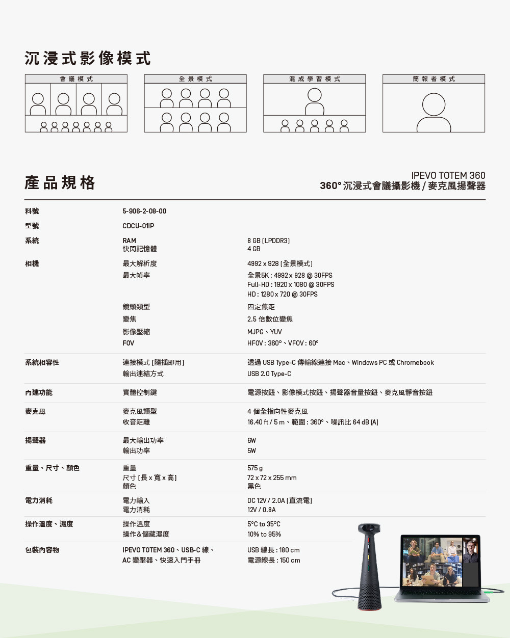 IPEVO TOTEM 360 是一套完整視訊解決方案,採用四顆鏡頭呈現 360° 無縫拼接影像、全向性擴音揚聲器,並透過四顆具備 AI 降噪功能的波束成形麥克風來捕捉語音。徹底改變了團隊會議、講座和簡報的方式。透過沉浸式視訊模式,讓線上參與者彷彿置身於會議室或講座現場,營造出真實的臨場感。TOTEM 的便攜性和簡易安裝使您能輕鬆將任何空間轉換為混合會議空間。