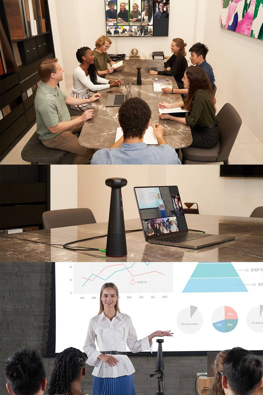 IPEVO TOTEM 360 是一款獨特且結合了高畫質攝影鏡頭、麥克風和揚聲器一體成形的多功能設備。只需將 TOTEM 360 輕鬆 放置於會議桌或會議室中心位置,即可完美捕捉所有與繪者的聲音與影像。
