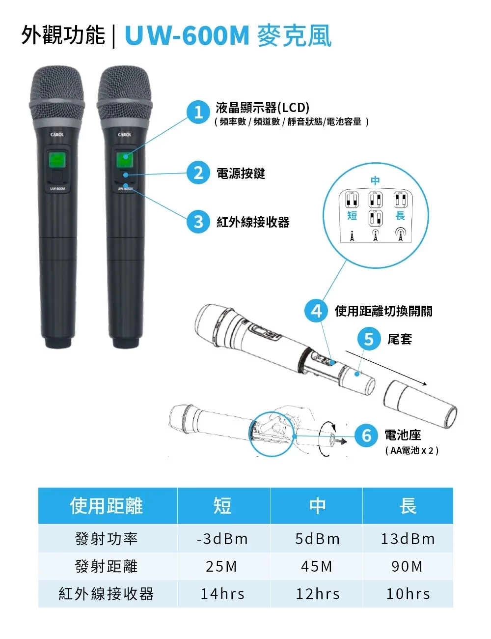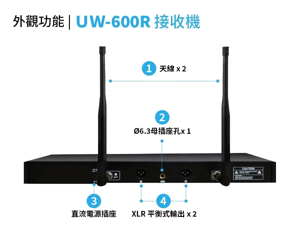規格1 : 手握式麥克風套組 UW-600R 接收機*1 UW-600M 手握麥克風*2