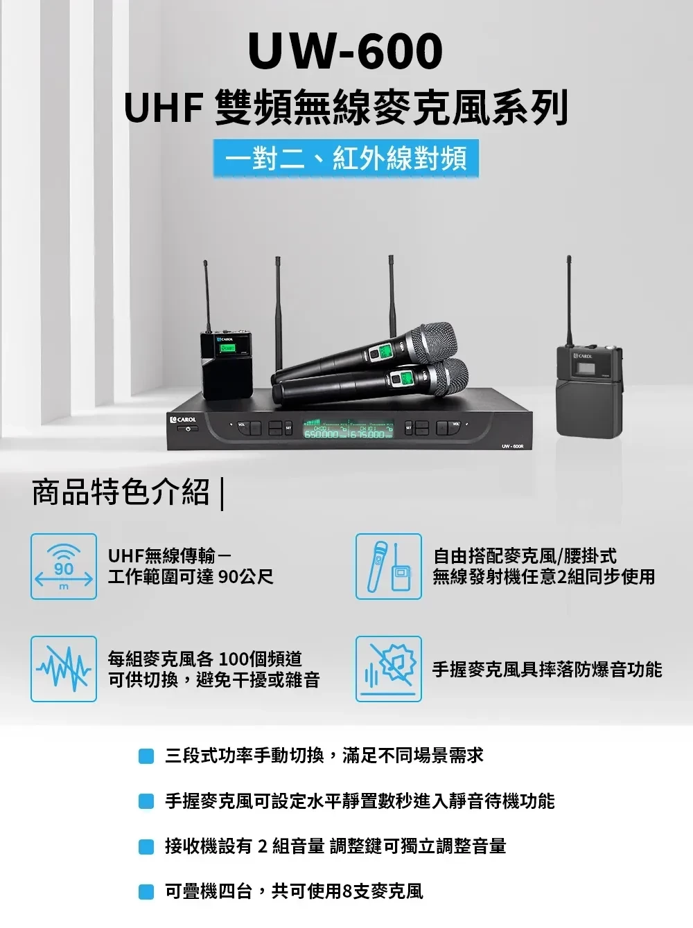 無線麥克風, CAROL無線麥克風,台灣製麥克風,雙頻道無線麥克風, 教學麥克風, 無線麥克風安裝, 藍牙無線麥克風,演講麥克風,CAROL UW-600 UHF 雙頻無線麥克風系統, CAROL UW-600