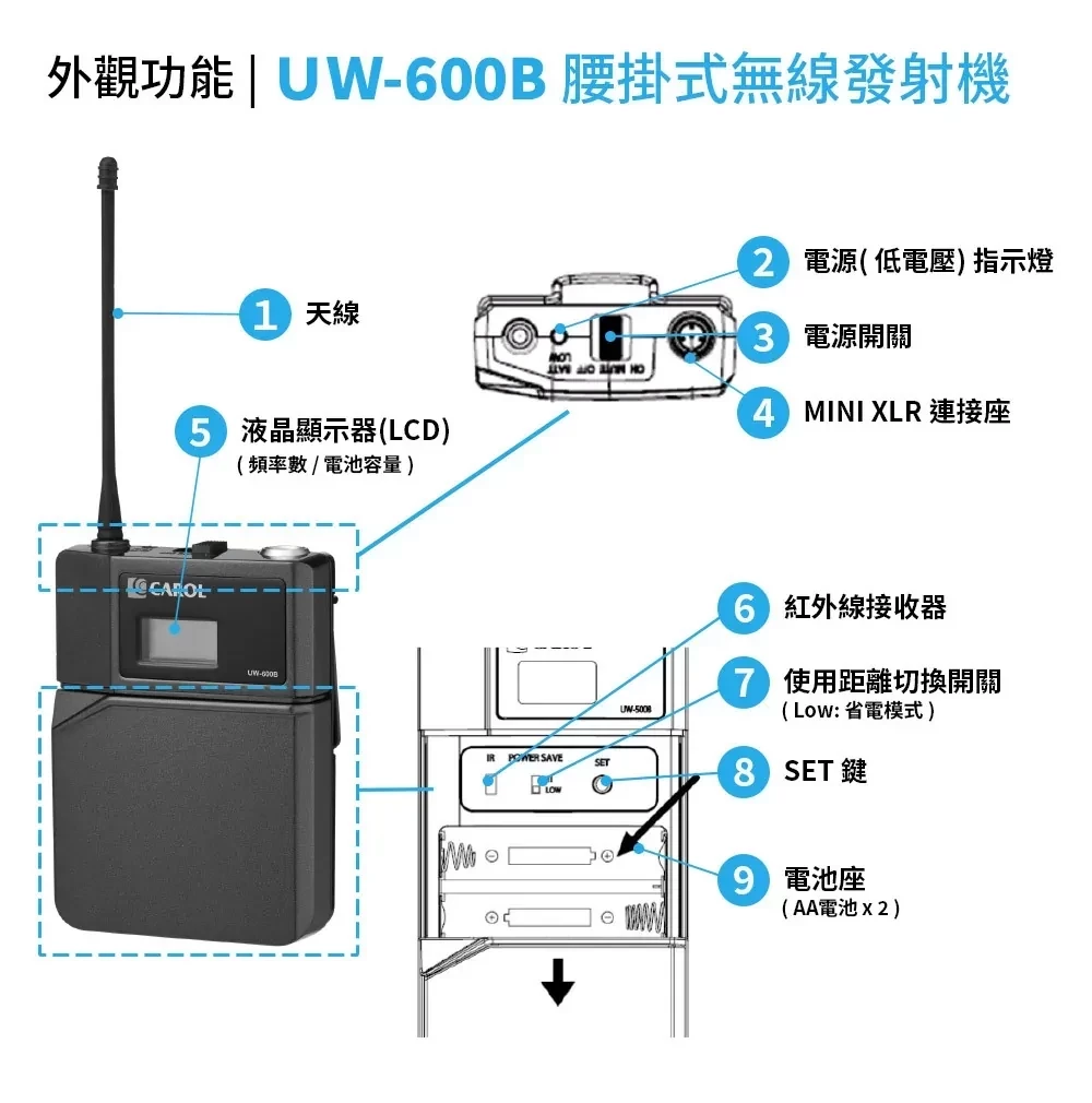 規格2 : 手握&腰掛式麥克風套組 UW-600R 接收機*1 UW-600M 手握麥克風*1 UW-600B 腰掛發射器*1 ( 領夾式麥克風 )