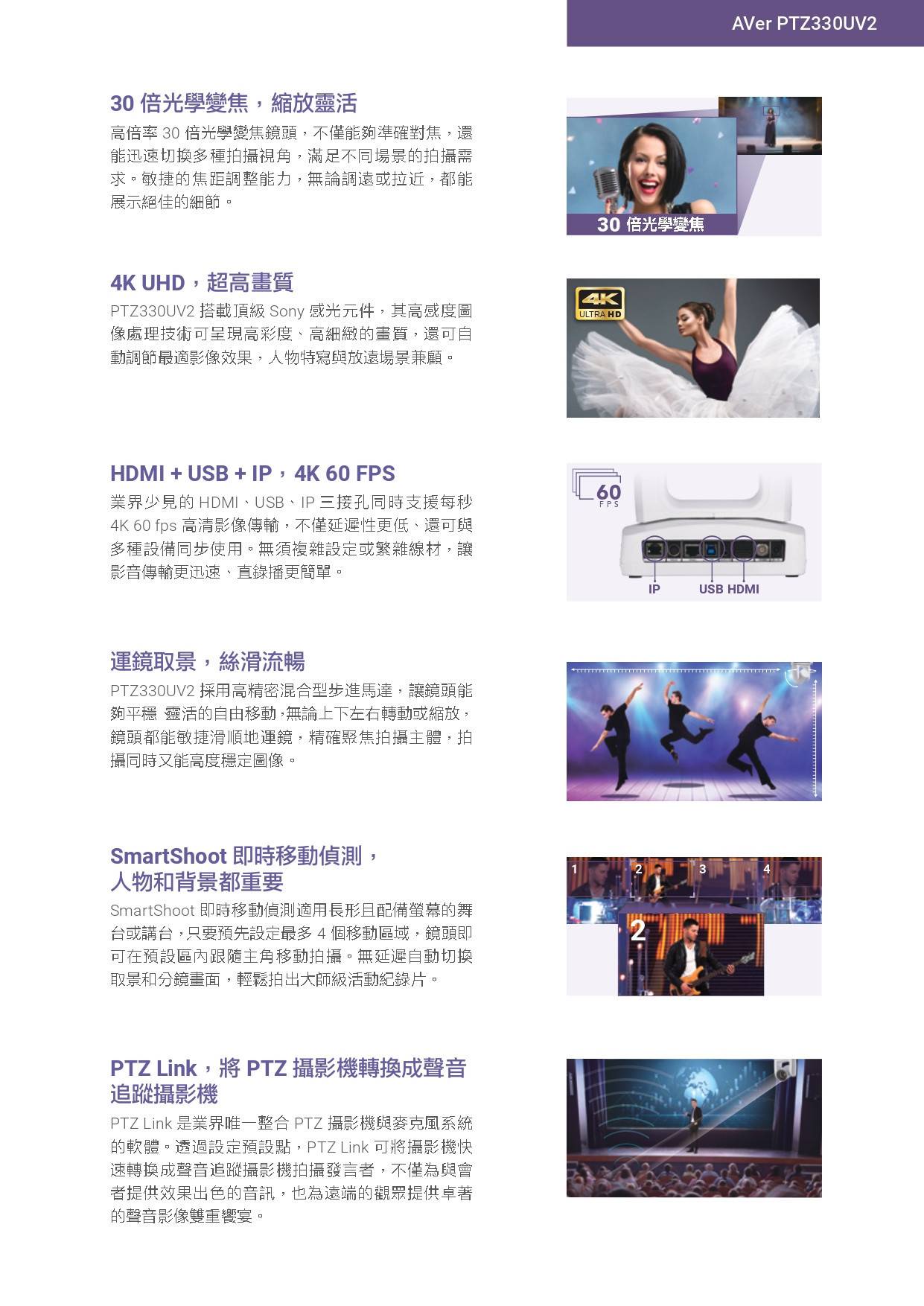 AVer PTC330UV2 自動追蹤攝影機搭載重磅 AI 追蹤科技,展現無與倫比的追蹤速度與精準度。承襲 AVer 領先業界的影像解碼技術並結合獨創「人形追蹤 (Human Detection)」 AI 演算法,一鍵就能夠啟動「講者追蹤」、「區域追蹤」和「複合追蹤」模式,追得快又準; 加上 4K 高解析和 30 倍光學變焦鏡頭,為數位廣播、影音直錄播、網路串流等專家使用者帶來強盛助力。就算不是行業專家,簡單的網路操作介面讓你直播串流秒上手、人人都是網紅推手。