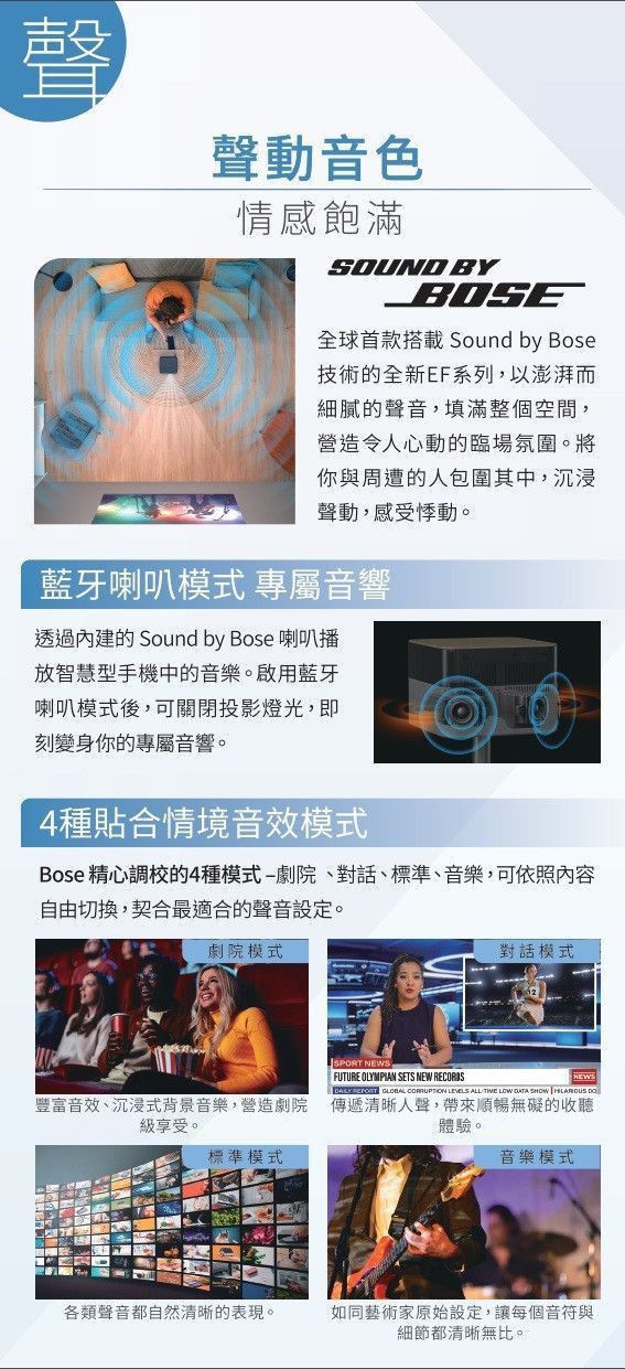 全球首款搭載Sound by Bose 優質音響的智慧迷你投影機,聲音更動人,並有四種模式,可以依據觀賞內容切換。