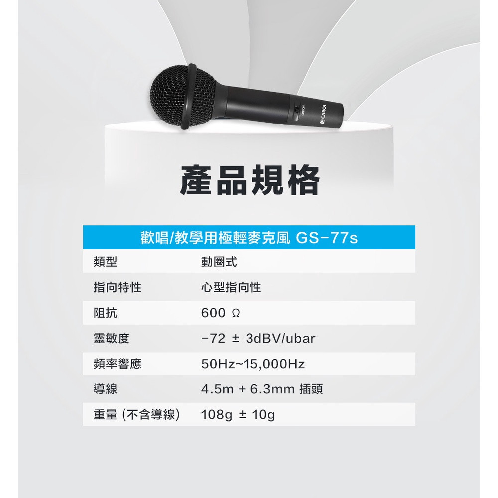 CAROL GS-77S 輕巧型K歌/教學/錄音麥克風,教學麥克風,演講用麥克風,教室麥克風, CAROL GS-77S, 有線麥克風, CAROL麥克風, 卡拉ok麥克風, 唱歌麥克風, 動圈式麥克風, 舞台演出麥克風,輕巧型麥克風