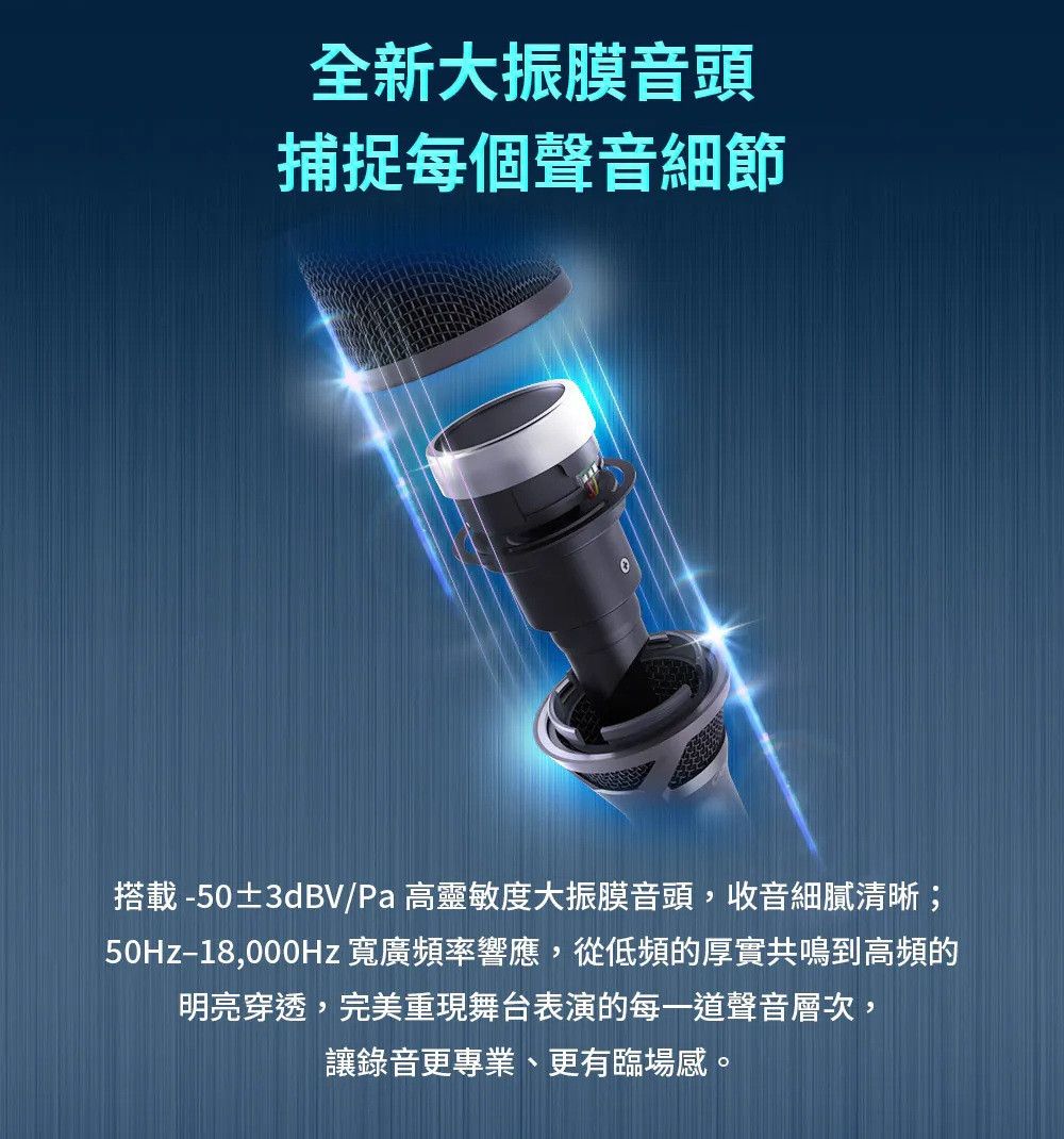專利主動式降手握雜音技術:有效去除表演過程中手持雜音,提升錄音品質。