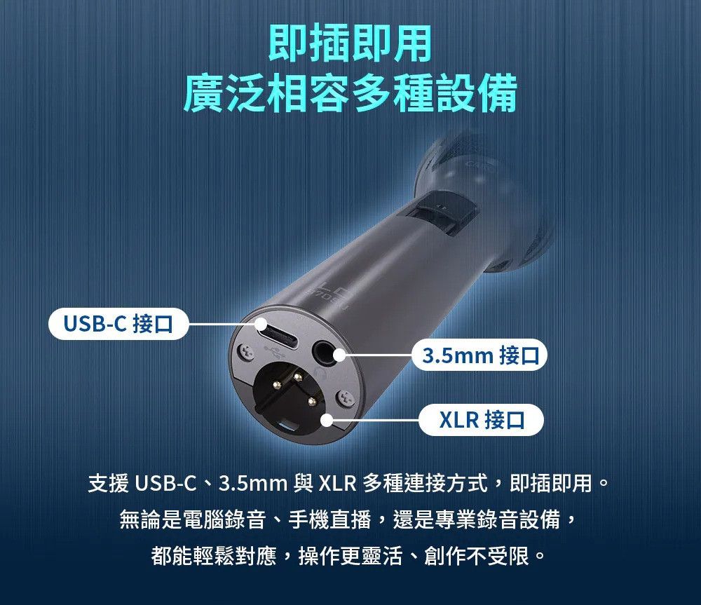 支援 USB Type-C / XLR / 3.5mm TRS,可連接手機、筆電、音響設備,即插即用。