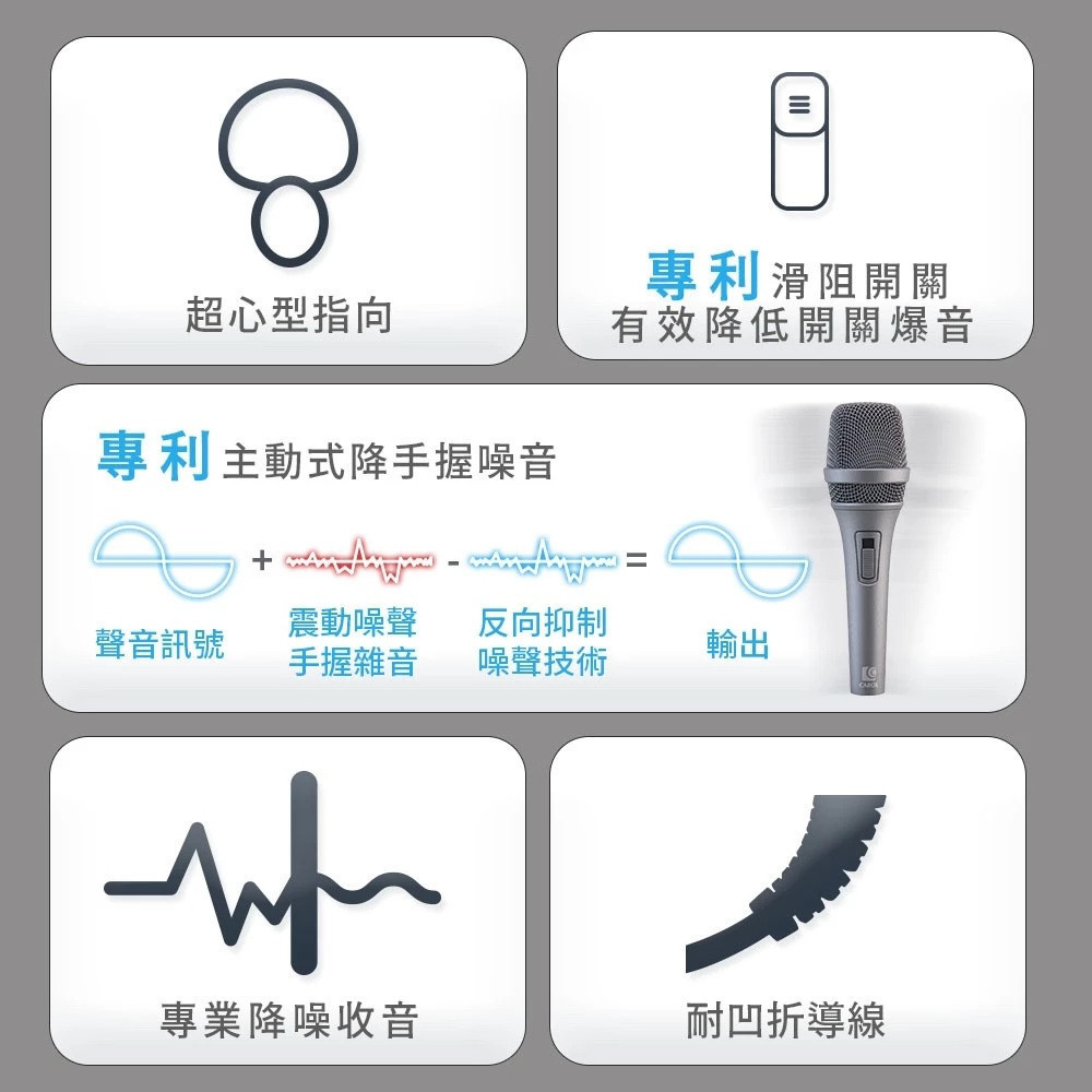 可靠性和耐用性:專業級麥克風通常具有高品質的構造和材料,能夠經受長時間使用和各種環境的考驗,確保其可靠性和耐用性。專業級主動式降噪手持式動圈式麥克風是一種功能強大、性能優異的音頻設備,適用於各種音頻錄製和現場表演場合,能夠提供高質量的聲音表現和極佳的使用體驗。