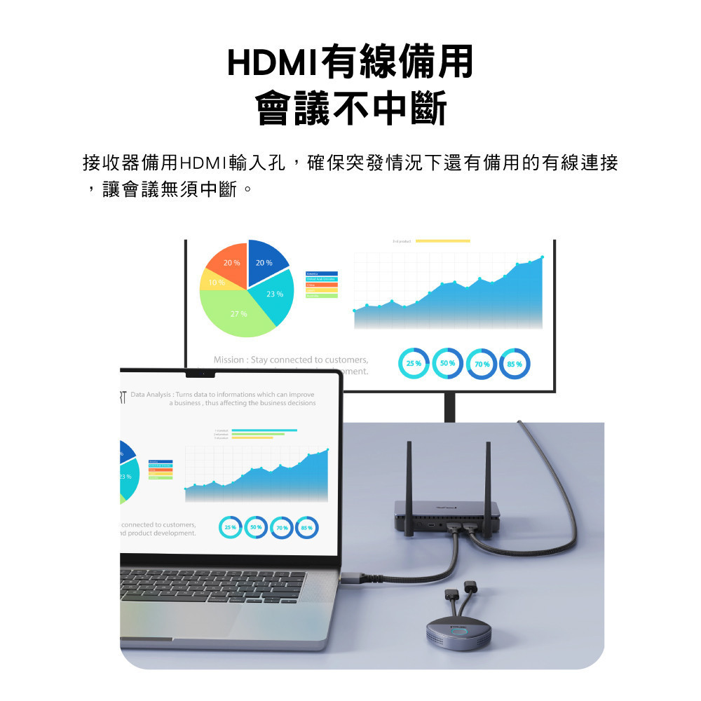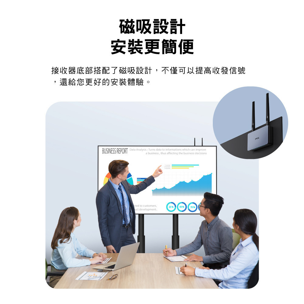 WTR-5600C 是專為企業設計的雙倍高效無線會議系統,支援雙筆電同時連線、一鍵切換,HDMI/Type-C雙發射兼容新舊設備。磁吸接收器安裝簡便,並配有HDMI有線備用輸入、獨立音訊輸出及100米穩定傳輸,讓會議更流暢高效。