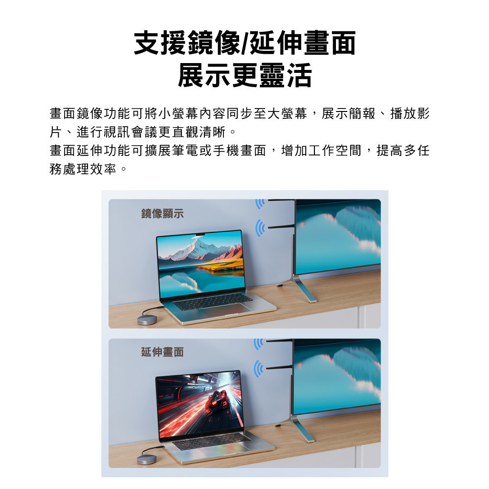 畫面鏡像功能可將小螢幕內容同步至大螢幕,展示簡報、播放影片、進行視訊會議更直觀清晰。畫面延伸功能可擴展筆電或手機畫面,增加工作空間,提高多任務處理效率。