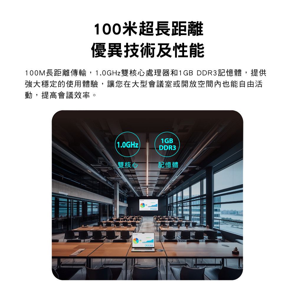 100M長距離傳輸,1.0GHz雙核心處理器和1GB DDR3記憶體,提供強大穩定的使用體驗,讓您在大型會議室或開放空間內也能自由活動,提高會議效率。