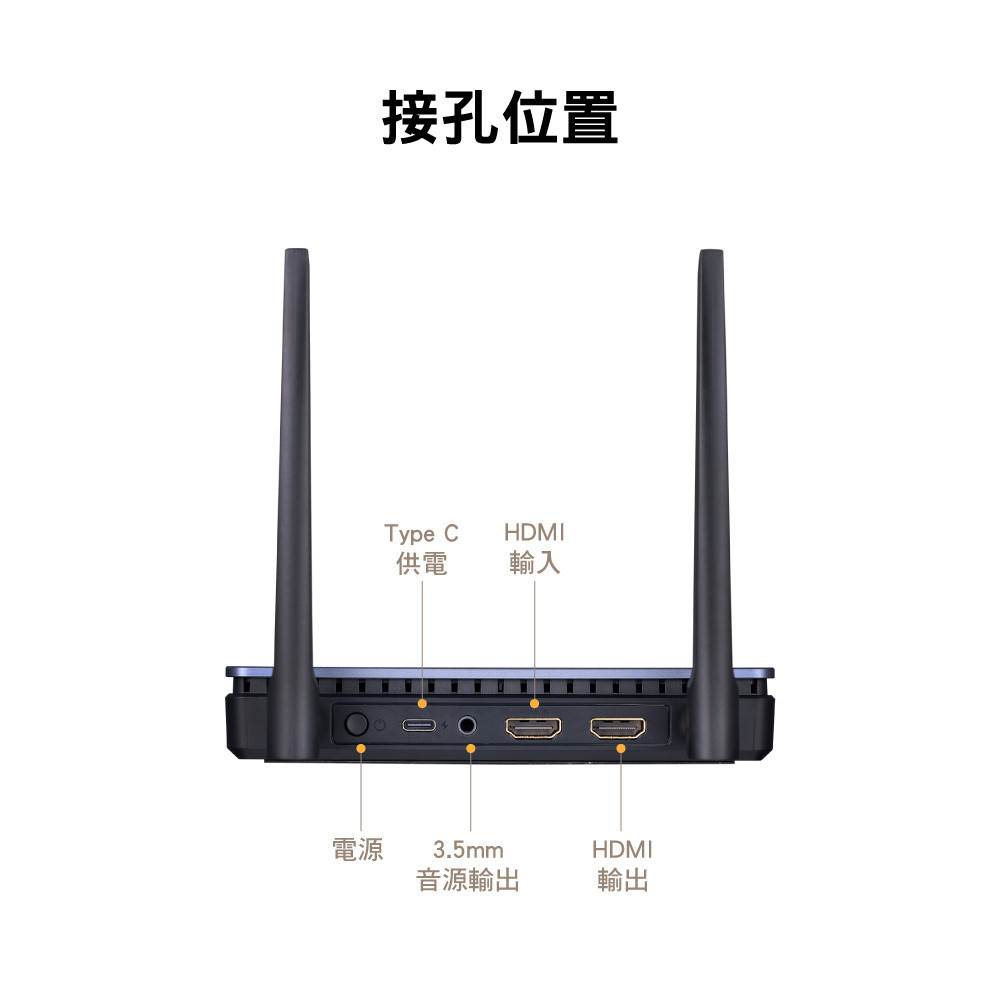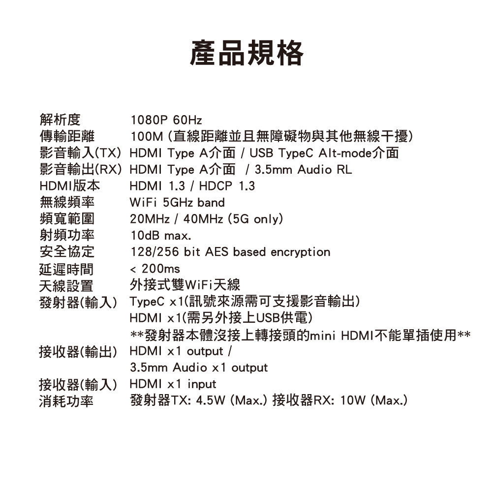發射器(輸入):TypeC x1(訊號來源需可支援影音輸出);HDMI x1(需另外接上USB供電)