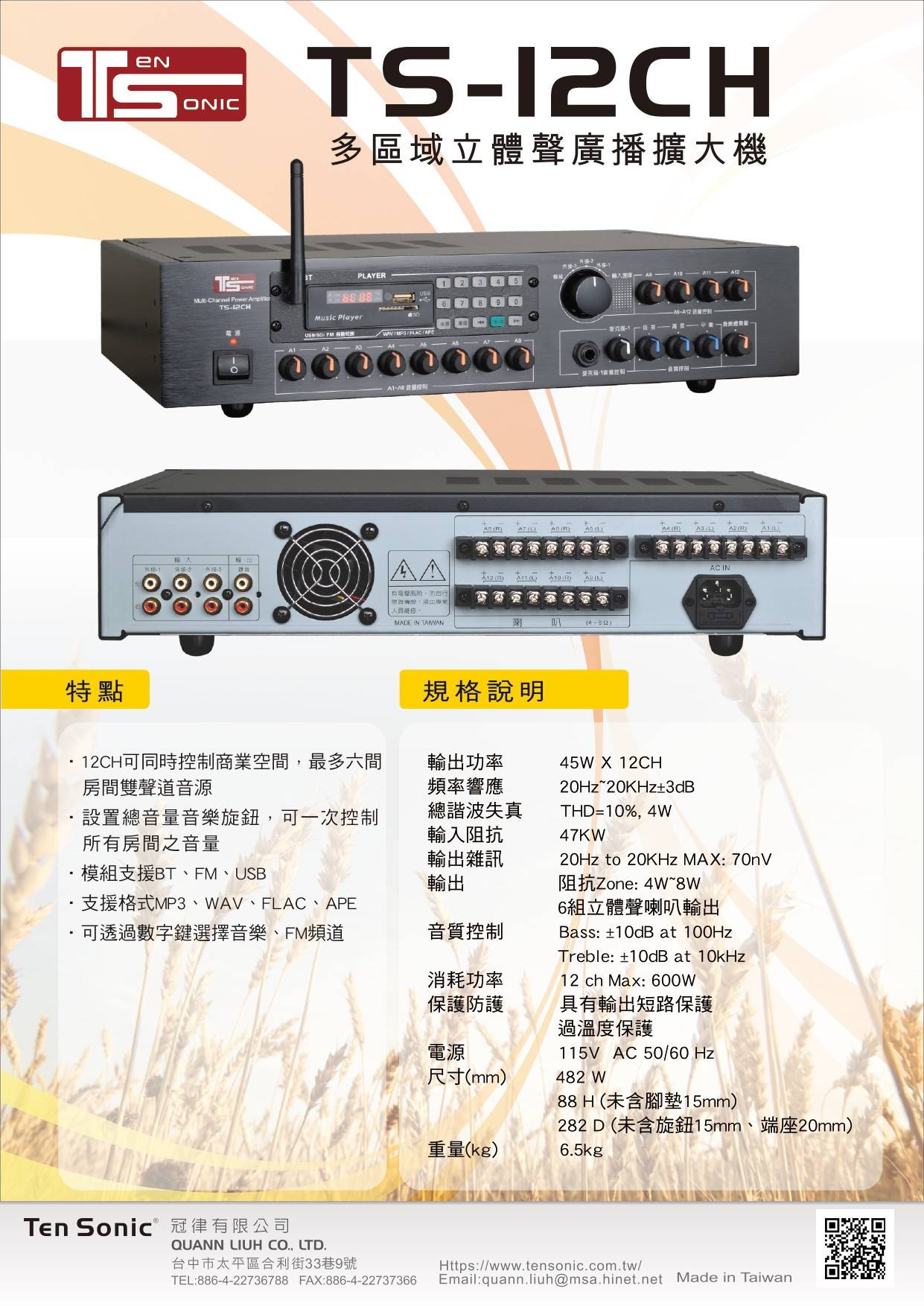 TS-12CH PA 擴大機,內建 BT 模組,內建多元的信號來源 - USB 多媒體播放器、BT、FM 收音機、外部音源、PC In (USB 音訊數位輸出,無類比傳輸損失),音質佳、容易操作、穩定度高。
