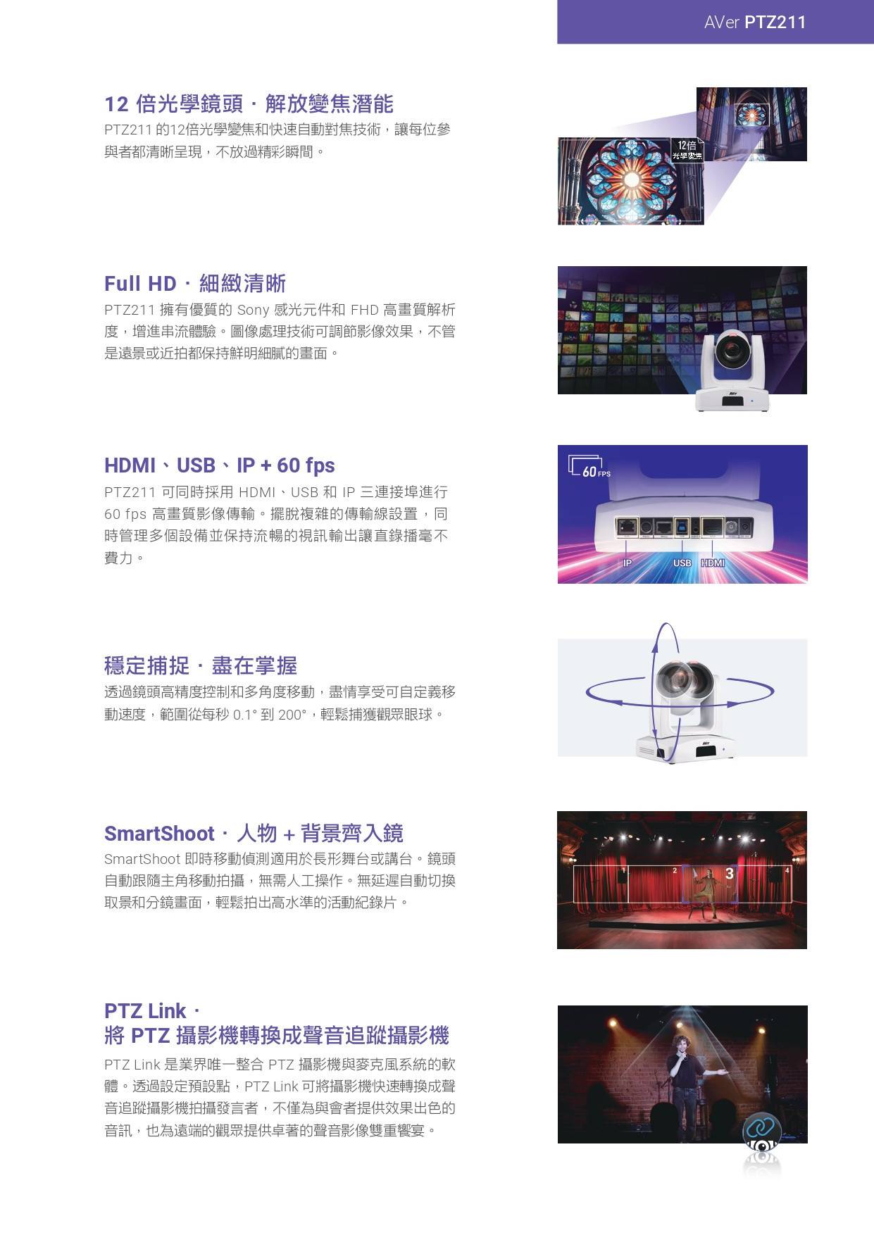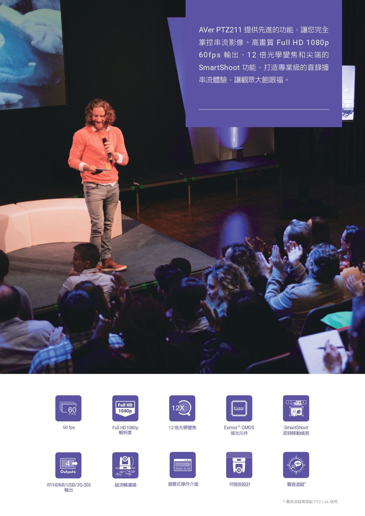 AVer PTZ211 提供先進的功能,讓您完全掌控串流影像。高畫質 Full HD 1080p 60fps 輸出、12 倍光學變焦和尖端的 SmartShoot 功能,打造專業級的直錄播串流體驗,讓觀眾大飽眼福。