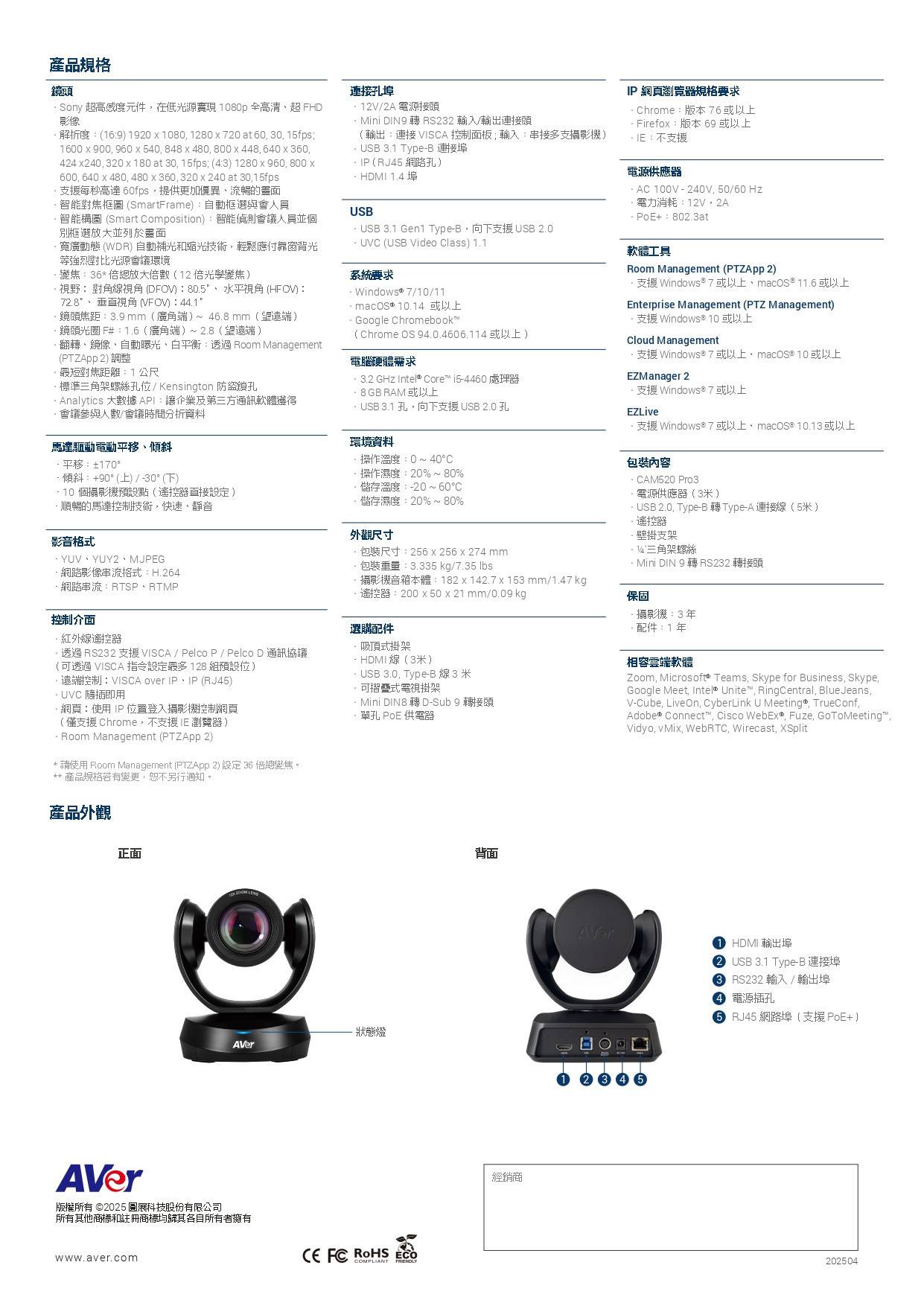 VC520 Pro3是一款優秀的高階視訊會議系統。它擁有一支36倍總變焦的PTZ攝像頭,增強的AVer SmartFrame功能,預設點追蹤以及Sony WDR傳感器。此外,VC520 Pro3提供3路輸出,包括HDMI連接,可提供更廣泛的串流選項和卓越的視訊和音訊體驗。但真正使VC520 Pro3脫穎而出的是其智能構圖功能,這是一個內建的人工智能功能,旨在快速捕捉會議參與者的高質量特寫照片。再加上可擴展串聯的延伸麥克風方案,VC520 Pro3為您提供卓越的視訊會議體驗。