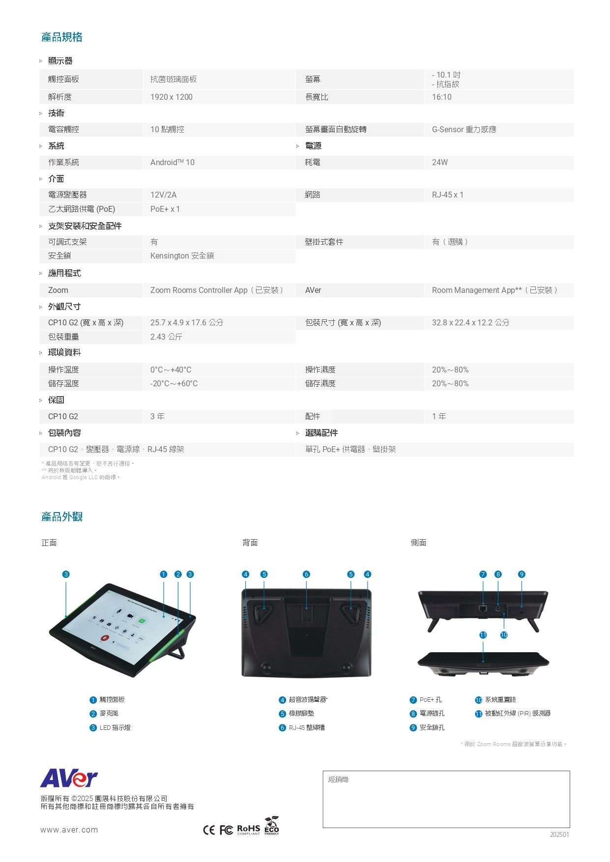 AVer CP10 G2 會議協作觸控控制器, AVer CP10 G2, 視訊會議設備,AVer CP10 G2, 會議觸控控制器,會議室控制面板,Zoom Rooms 控制器,Teams Rooms 控制器