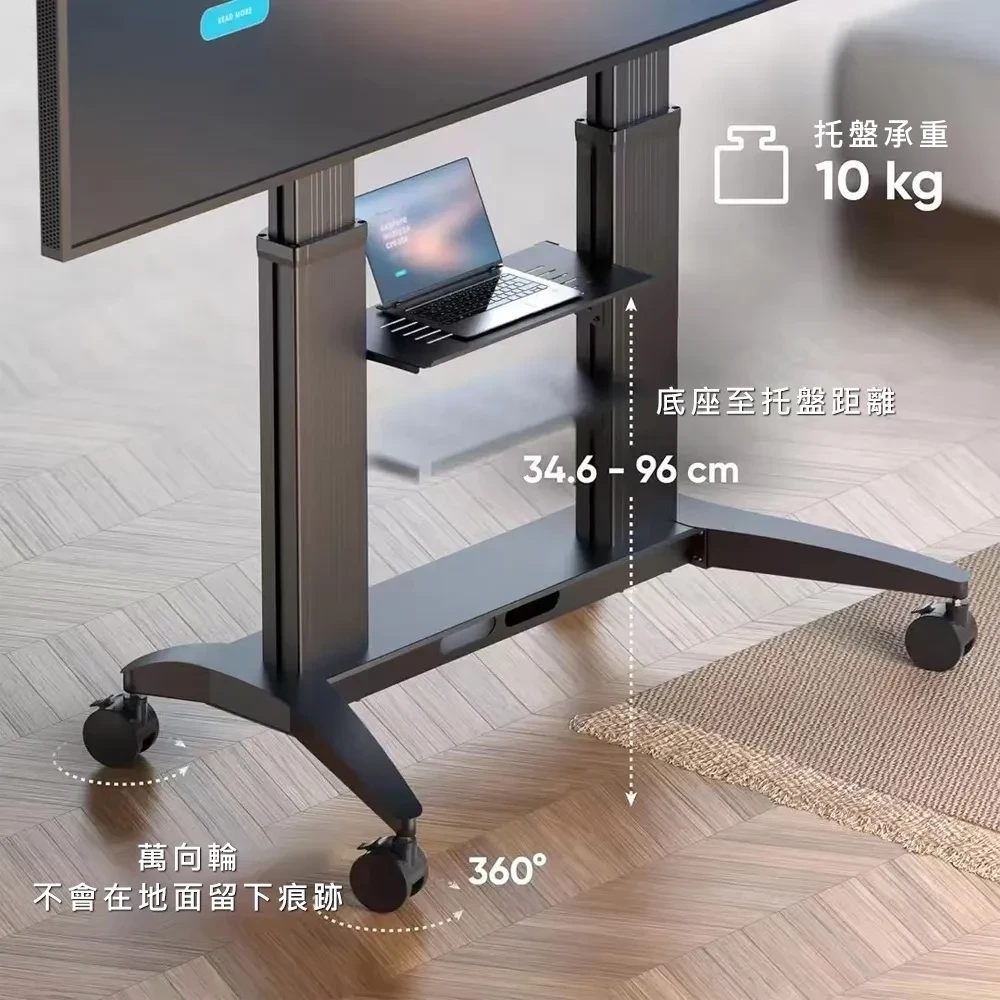 採用 加厚鋼材結構,具備優異承重能力,搭配 四輪靜音滑輪 與 雙煞車鎖定,移動時順暢不晃動,固定後更加穩固。支援 高度調整 與 角度微調,可依不同場景與觀看距離調整最佳視角。