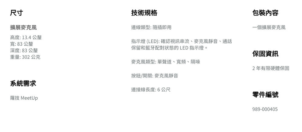 因為房間大小各有不同,我們製造了擴展麥克風,以提供在不同房間組態環境下使用的彈性。擴展麥克風可將 MeetUp 麥克風的收音範圍延長到 5 公尺。