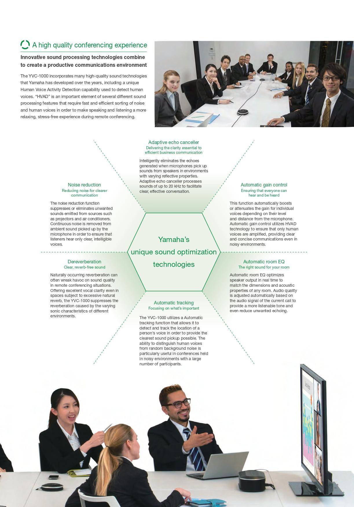 YVC-1000 融合 Yamaha 多年來持續開發的許多優質音響技術,包括用來偵測人聲的獨特”人聲主動偵測 “(HVAD) 功能。「HVAD」是多種音訊處理功能的重要部分,可快速有效地分類噪音與人聲,讓遠距會議期間說話和聆聽體驗都更舒適且無壓力。