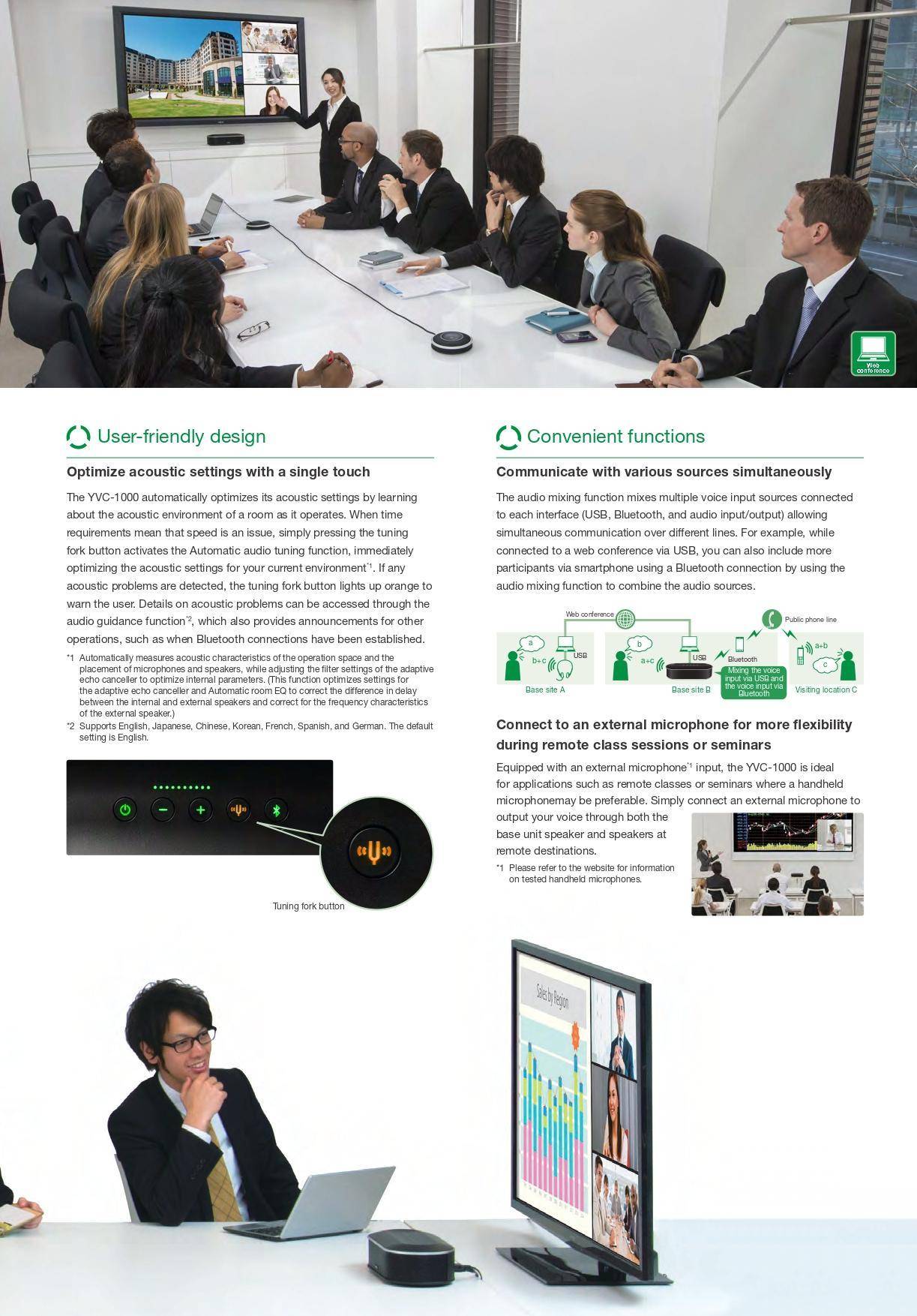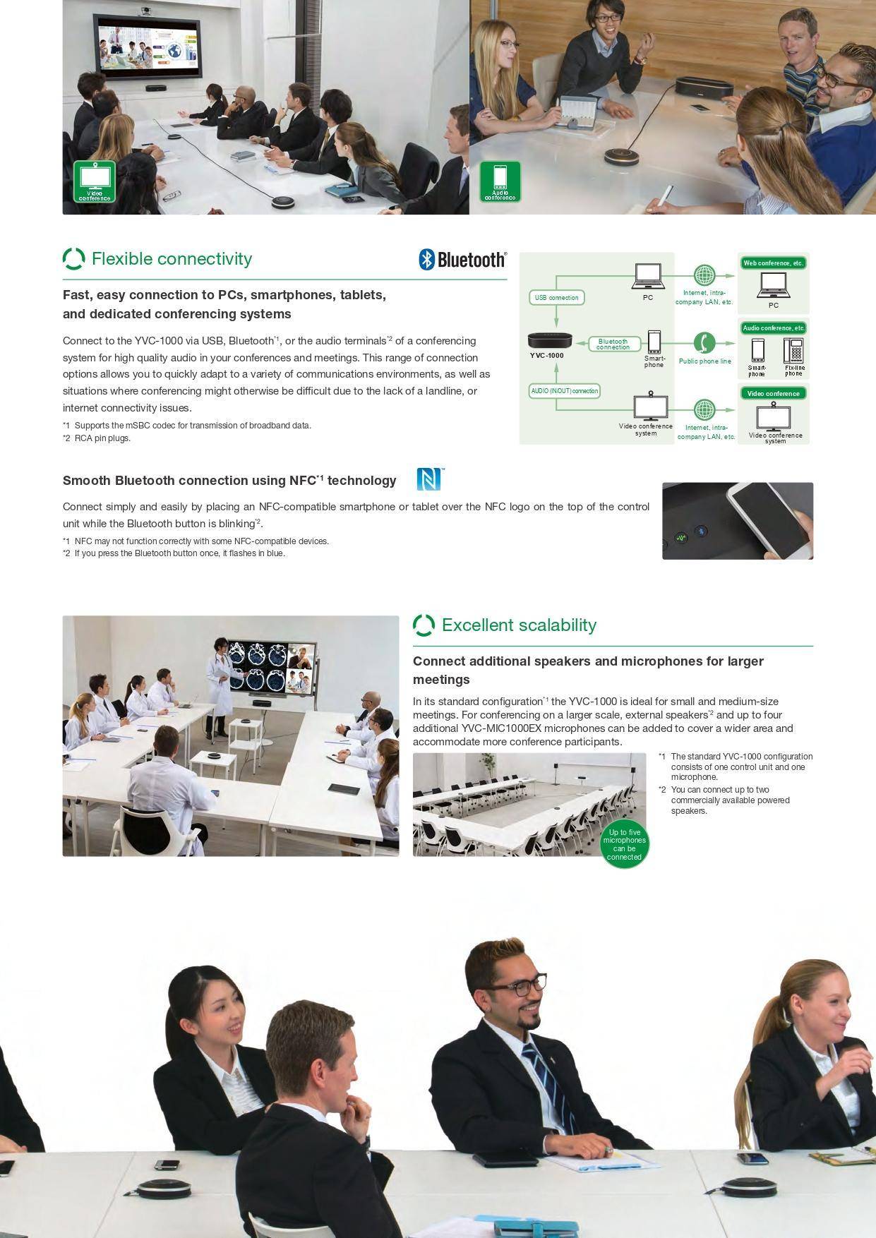 使用 USB、藍芽*1 或會議系統的音訊端子*2 連接到 YVC-1000,讓您進行會議時享有優質的音效。多樣的連接選項讓您可以快速適應各種場合以及因缺少室內電話或網際網路連線問題而無法舉行會議的情況。