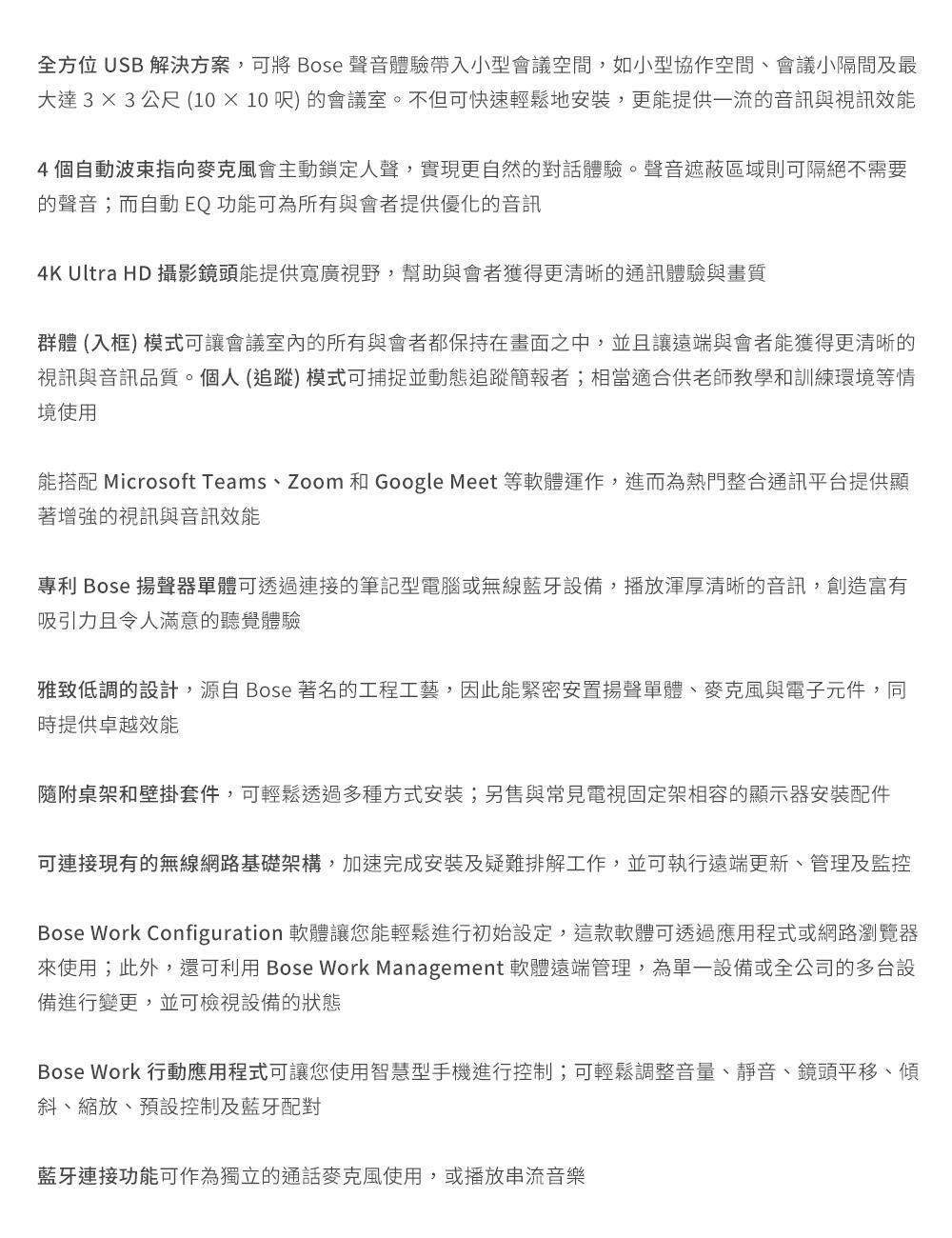 BOSE Videobar VB‑S,BOSE VB‑S,BOSE 會議設備, BOSE 視訊會議系統,BOSE 會議室音視訊設備, USB 視訊會議設備,USB 視訊條,全向麥克風會議設備,4K 視訊會議攝影機,AI 自動取景攝影機,降噪會議麥克風,一體式視訊會議設備,小型會議室視訊設備,Zoom 認證會議設備,Teams 認證會議設備