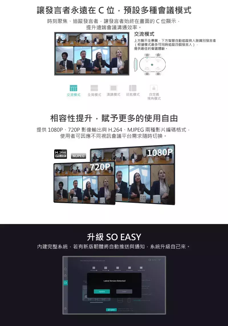 搭載全景鏡頭,可完整捕捉會議室全貌,避免傳統視訊設備的死角問題。