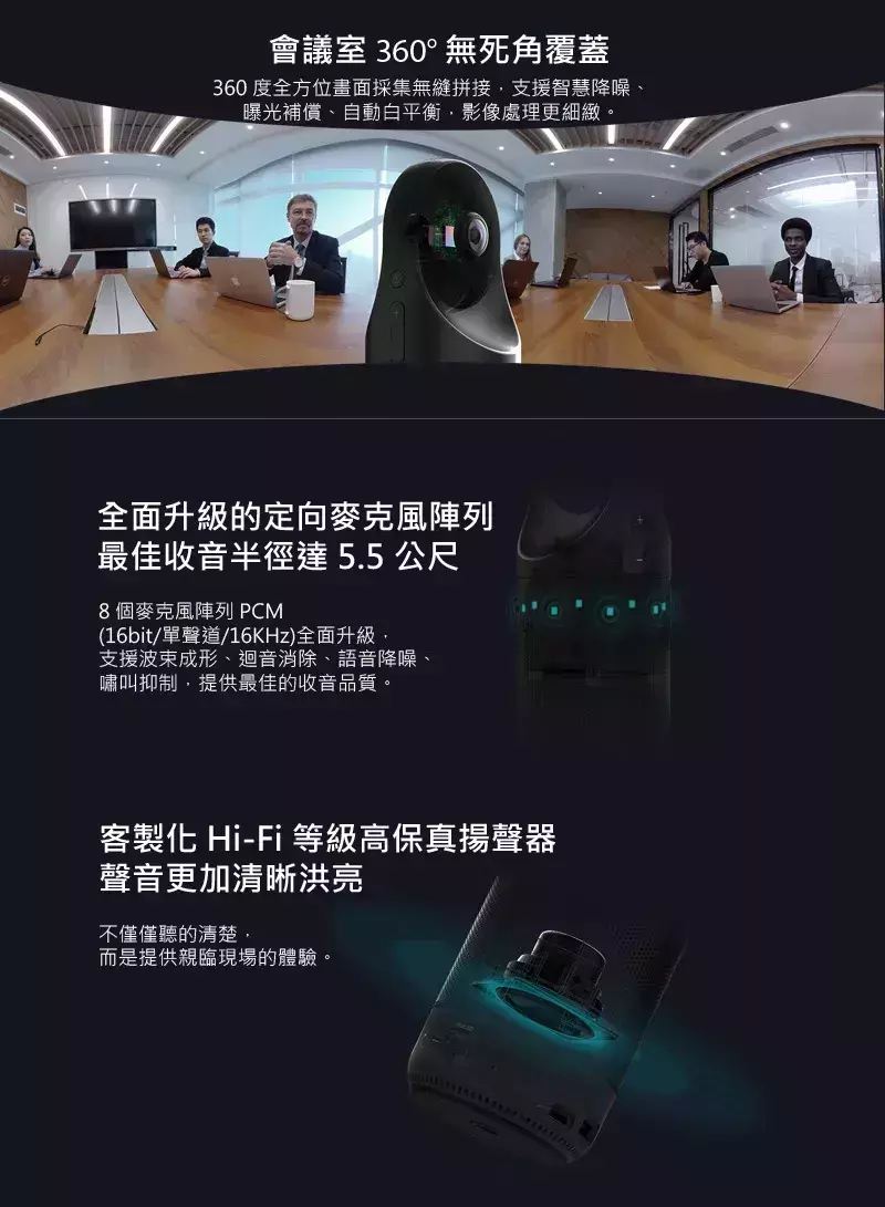 提供完整 360° 視野,讓每位與會者都能被清楚看到與聽到。