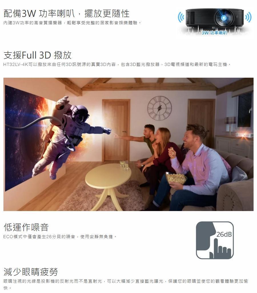 Optoma 奧圖碼 HT32LV‑4K 高亮度家庭娛樂投影機|遊戲/電影/運動賽事|4000 流明 Full HD 支援 4K HDR