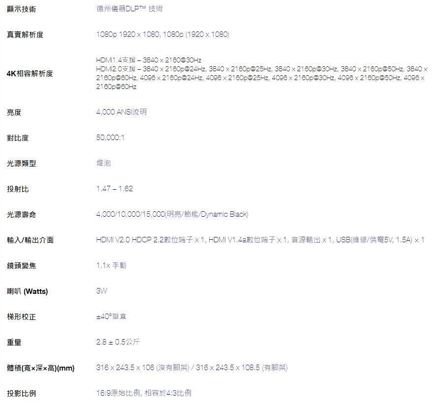 - HDMI 2.0 + HDCP 2.2,可接收 4K HDR 內容,亮暗細節更立體。