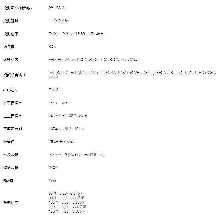 投影畫面尺寸 28 ~ 301吋